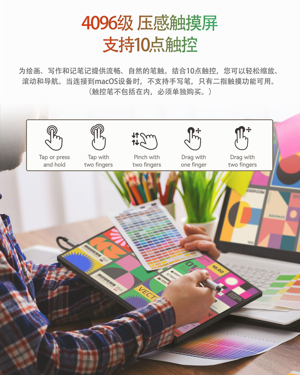 描述:3K 4096级压感电容触摸屏 十点触控 CNC铝合金机身 带隐藏支架 VESA孔位